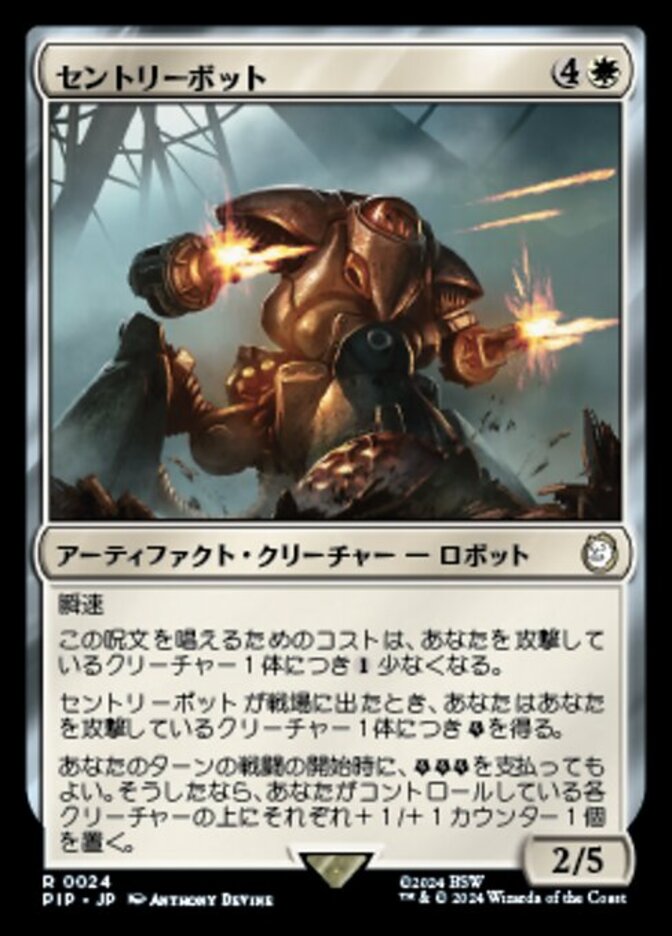 | Rules | Flash This spell costs less to cast for each creature attacking you. When Sentry Bot enters the battlefield, you get for each creature attacking you. At the beginning of combat on your turn, you may pay . If you do, put a +1/+1 counter on each creature you control. |