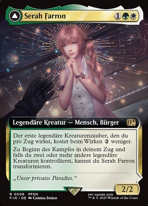 | Rules | The first legendary creature spell you cast each turn costs less to cast. At the beginning of combat on your turn, if you control two or more other legendary creatures, you may transform Serah Farron. // The first legendary creature spell you cast each turn costs less to cast. Legendary creatures you control get +2/+2. |