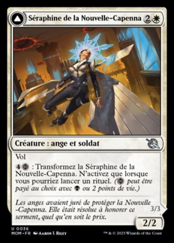 | Rules | Flying : Transform Seraph of New Capenna. Activate only as a sorcery. ( can be paid with either or 2 life.) // Flying Whenever Seraph of New Phyrexia attacks, you may sacrifice another creature or artifact. If you do, Seraph of New Phyrexia gets +2/+1 until end of turn. |