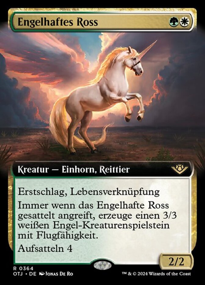 | Rules | First strike, lifelink Whenever Seraphic Steed attacks while saddled, create a 3/3 white Angel creature token with flying. Saddle 4 (Tap any number of other creatures you control with total power 4 or more: This Mount becomes saddled until end of turn. Saddle only as a sorcery.) |