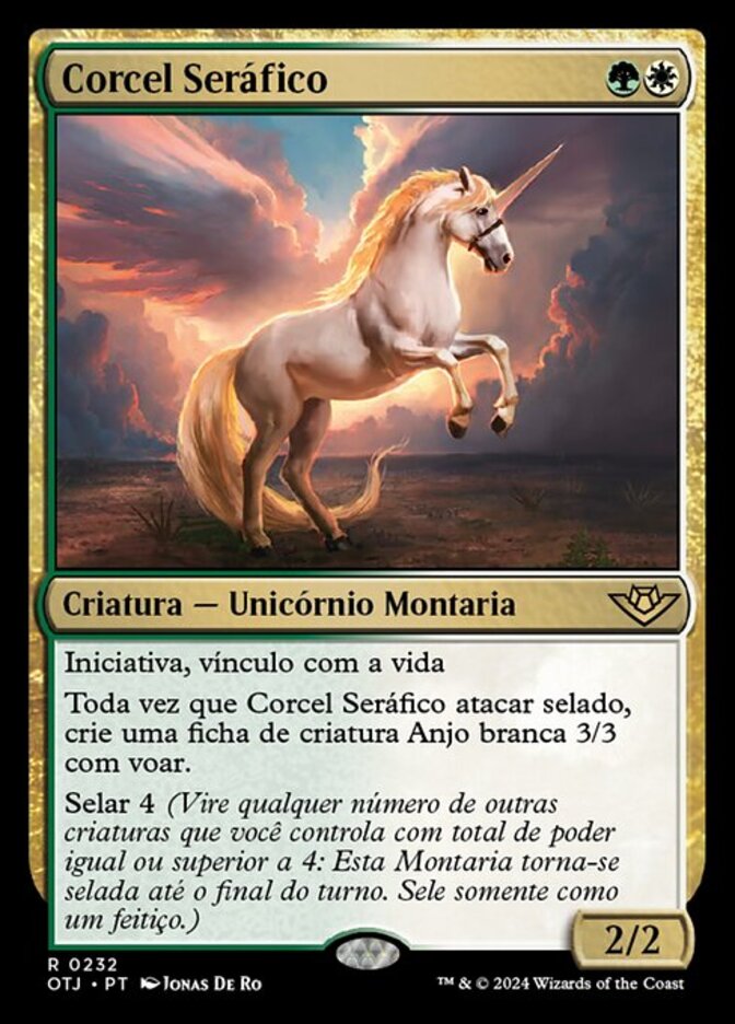 | Rules | First strike, lifelink Whenever Seraphic Steed attacks while saddled, create a 3/3 white Angel creature token with flying. Saddle 4 (Tap any number of other creatures you control with total power 4 or more: This Mount becomes saddled until end of turn. Saddle only as a sorcery.) |