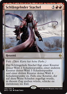 | Rules | Devoid (This card has no color.) Serpentine Spike deals 2 damage to target creature, 3 damage to another target creature, and 4 damage to a third target creature. If a creature dealt damage this way would die this turn, exile it instead. |