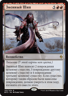 | Rules | Devoid (This card has no color.) Serpentine Spike deals 2 damage to target creature, 3 damage to another target creature, and 4 damage to a third target creature. If a creature dealt damage this way would die this turn, exile it instead. |