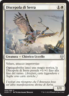 | Rules | Flying, first strike Whenever you cast a historic spell, Serra Disciple gets +1/+1 until end of turn. (Artifacts, legendaries, and Sagas are historic.) |