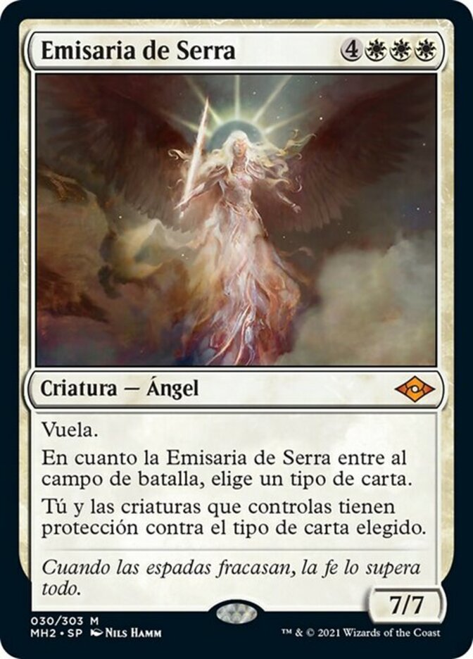 | Rules | Flying As Serra's Emissary enters the battlefield, choose a card type. You and creatures you control have protection from the chosen card type. |