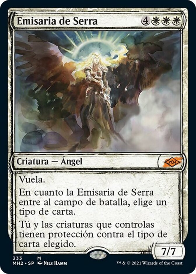 | Rules | Flying As Serra's Emissary enters the battlefield, choose a card type. You and creatures you control have protection from the chosen card type. |