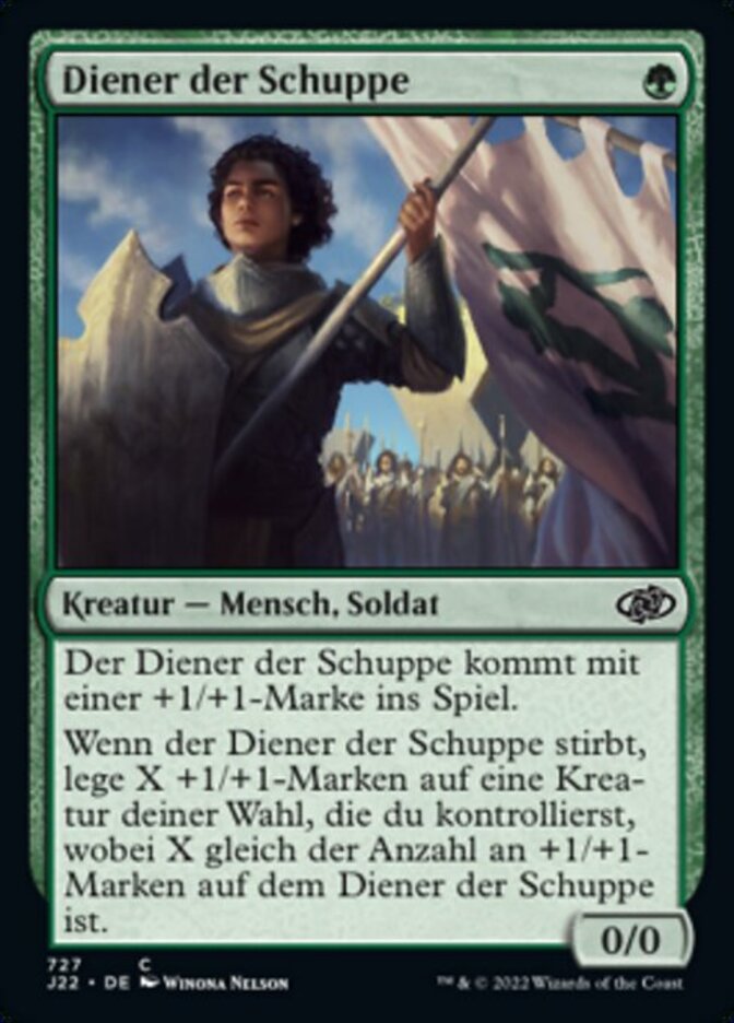 | Rules | Servant of the Scale enters the battlefield with a +1/+1 counter on it. When Servant of the Scale dies, put X +1/+1 counters on target creature you control, where X is the number of +1/+1 counters on Servant of the Scale. |
