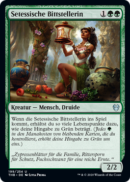 | Rules | When Setessan Petitioner enters the battlefield, you gain life equal to your devotion to green. (Each in the mana costs of permanents you control counts toward your devotion to green.) |
