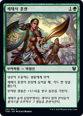 | Rules | Enchant creature you control When Setessan Training enters the battlefield, draw a card. Enchanted creature gets +1/+0 and has trample. (It can deal excess combat damage to the player or planeswalker it's attacking.) |