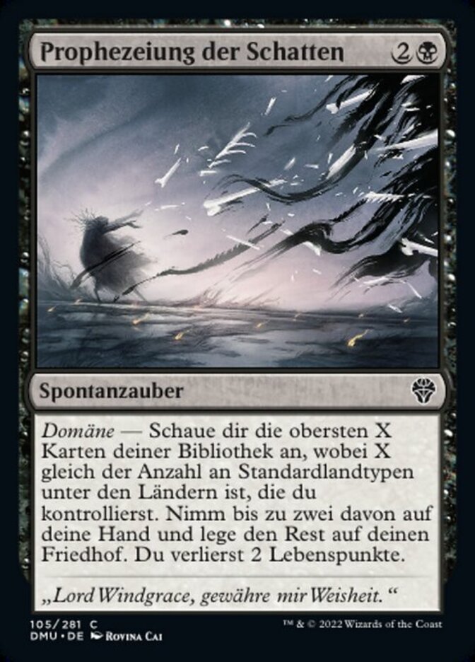 | Rules | Domain — Look at the top X cards of your library, where X is the number of basic land types among lands you control. Put up to two of them into your hand and the rest into your graveyard. You lose 2 life. |