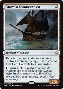 | Rules | Whenever a creature you control explores, put a +1/+1 counter on Shadowed Caravel. Crew 2 (Tap any number of creatures you control with total power 2 or more: This Vehicle becomes an artifact creature until end of turn.) |