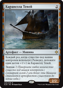 | Rules | Whenever a creature you control explores, put a +1/+1 counter on Shadowed Caravel. Crew 2 (Tap any number of creatures you control with total power 2 or more: This Vehicle becomes an artifact creature until end of turn.) |