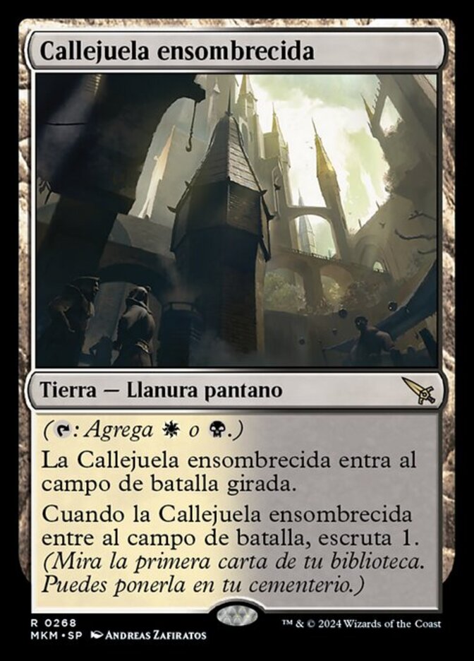 | Rules | (: Add or .) Shadowy Backstreet enters the battlefield tapped. When Shadowy Backstreet enters the battlefield, surveil 1. (Look at the top card of your library. You may put it into your graveyard.) |