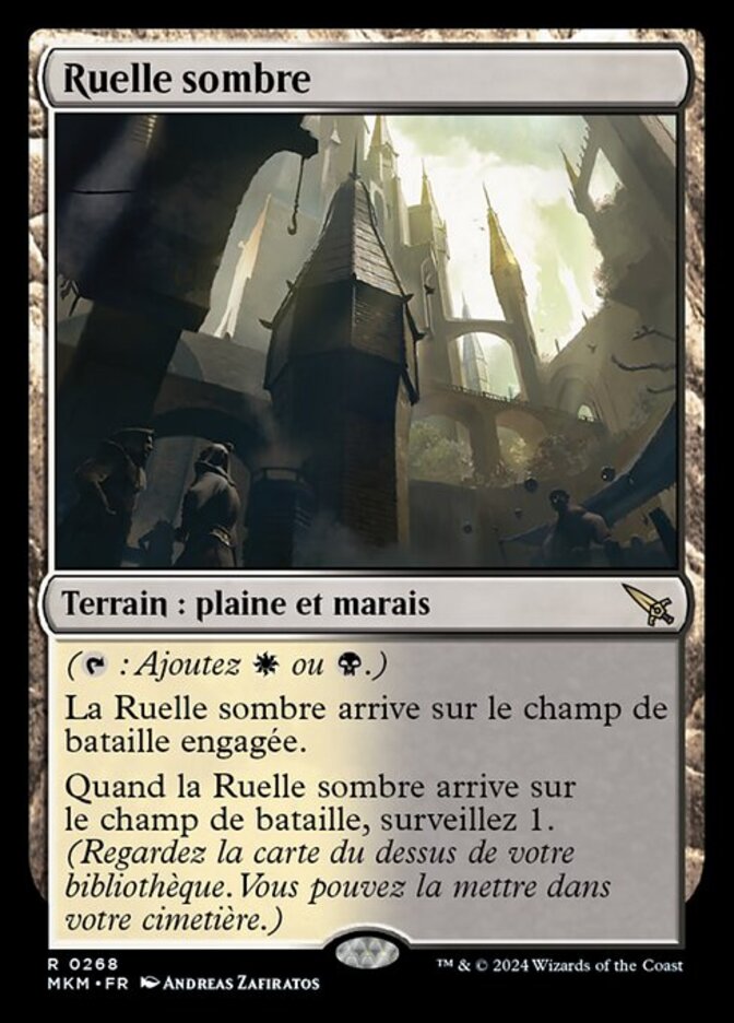 | Rules | (: Add or .) Shadowy Backstreet enters the battlefield tapped. When Shadowy Backstreet enters the battlefield, surveil 1. (Look at the top card of your library. You may put it into your graveyard.) |