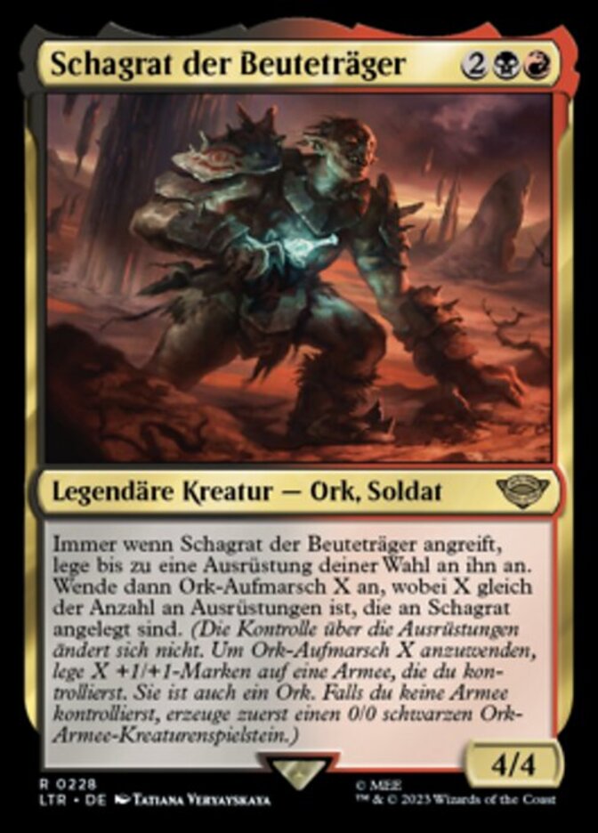 | Rules | Whenever Shagrat, Loot Bearer attacks, attach up to one target Equipment to it. Then amass Orcs X, where X is the number of Equipment attached to Shagrat. (Control of the Equipment doesn't change. To amass Orcs X, put X+1/+1 counters on an Army you control. It's also an Orc. If you don't control an Army, create a 0/0 black Orc Army creature token first.) |