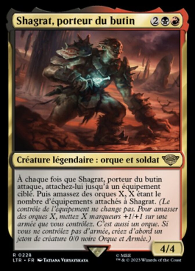 | Rules | Whenever Shagrat, Loot Bearer attacks, attach up to one target Equipment to it. Then amass Orcs X, where X is the number of Equipment attached to Shagrat. (Control of the Equipment doesn't change. To amass Orcs X, put X+1/+1 counters on an Army you control. It's also an Orc. If you don't control an Army, create a 0/0 black Orc Army creature token first.) |