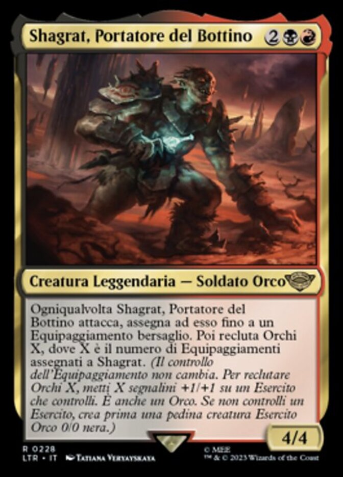 | Rules | Whenever Shagrat, Loot Bearer attacks, attach up to one target Equipment to it. Then amass Orcs X, where X is the number of Equipment attached to Shagrat. (Control of the Equipment doesn't change. To amass Orcs X, put X+1/+1 counters on an Army you control. It's also an Orc. If you don't control an Army, create a 0/0 black Orc Army creature token first.) |