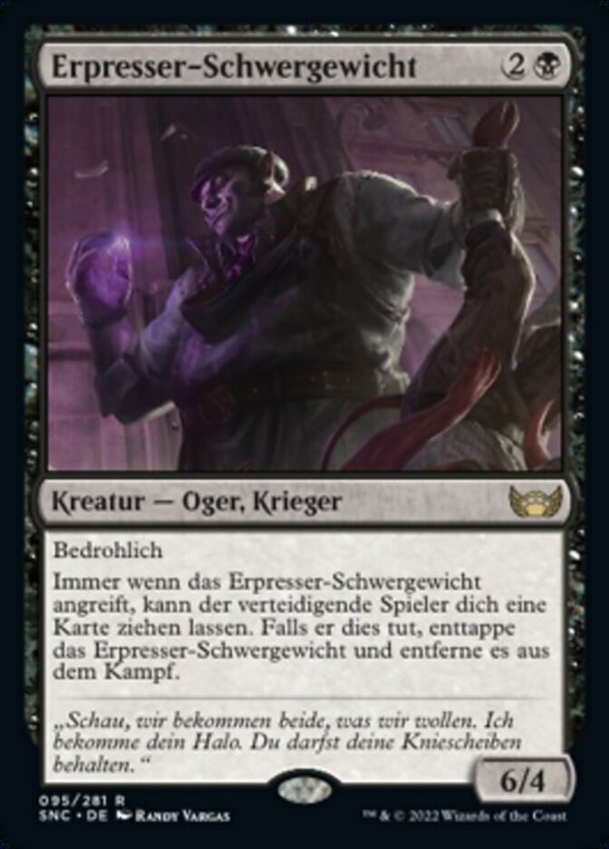 | Rules | Menace Whenever Shakedown Heavy attacks, defending player may have you draw a card. If they do, untap Shakedown Heavy and remove it from combat. |
