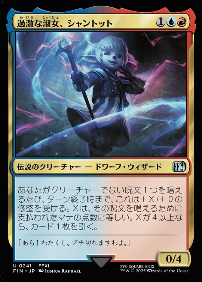 | Rules | Whenever you cast a noncreature spell, Shantotto gets +X/+0 until end of turn, where X is the amount of mana spent to cast that spell. If X is 4 or more, draw a card. |