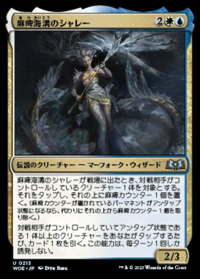 | Rules | When Sharae of Numbing Depths enters the battlefield, tap target creature an opponent controls and put a stun counter on it. (If a permanent with a stun counter would become untapped, remove one from it instead.) Whenever you tap one or more untapped creatures your opponents control, draw a card. This ability triggers only once each turn. |