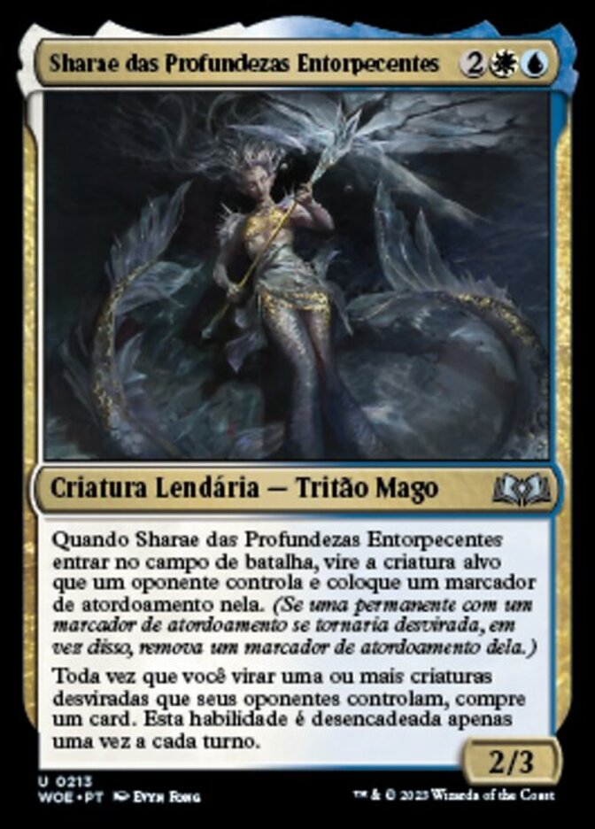 | Rules | When Sharae of Numbing Depths enters the battlefield, tap target creature an opponent controls and put a stun counter on it. (If a permanent with a stun counter would become untapped, remove one from it instead.) Whenever you tap one or more untapped creatures your opponents control, draw a card. This ability triggers only once each turn. |