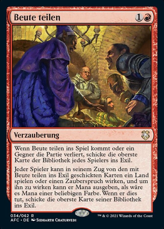 | Rules | When Share the Spoils enters the battlefield or an opponent loses the game, exile the top card of each player's library. During each player's turn, that player may play a land or cast a spell from among cards exiled with Share the Spoils, and they may spend mana as though it were mana of any color to cast that spell. When they do, exile the top card of their library. |