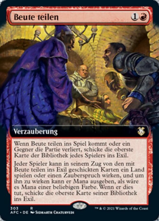 | Rules | When Share the Spoils enters the battlefield or an opponent loses the game, exile the top card of each player's library. During each player's turn, that player may play a land or cast a spell from among cards exiled with Share the Spoils, and they may spend mana as though it were mana of any color to cast that spell. When they do, exile the top card of their library. |