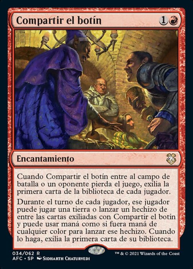 | Rules | When Share the Spoils enters the battlefield or an opponent loses the game, exile the top card of each player's library. During each player's turn, that player may play a land or cast a spell from among cards exiled with Share the Spoils, and they may spend mana as though it were mana of any color to cast that spell. When they do, exile the top card of their library. |