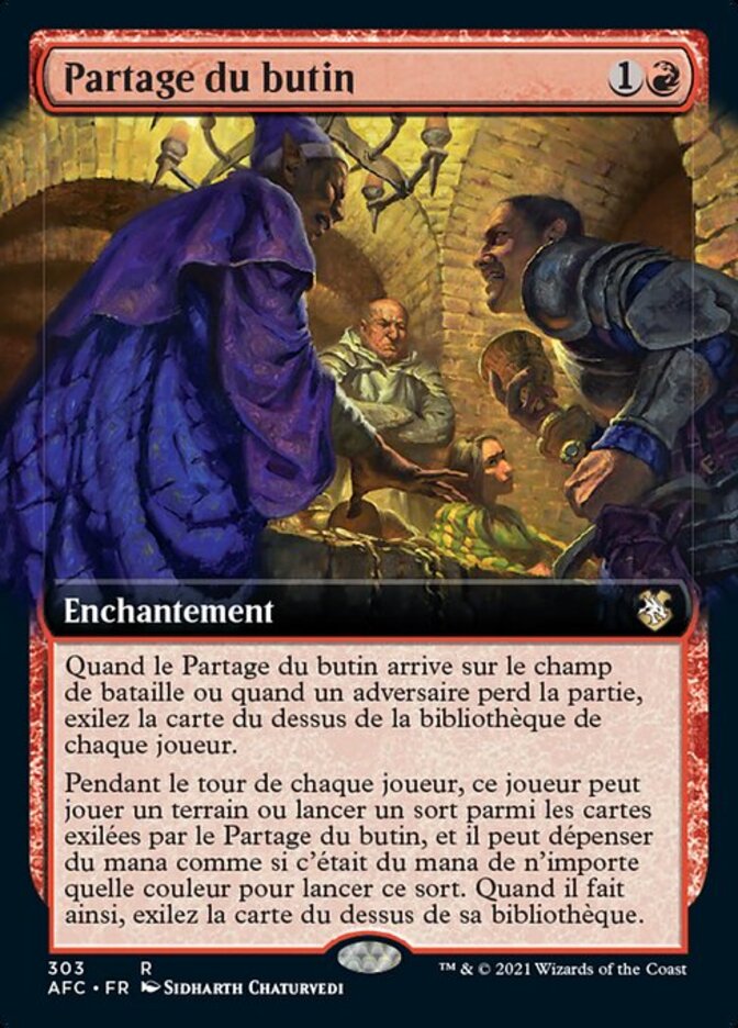 | Rules | When Share the Spoils enters the battlefield or an opponent loses the game, exile the top card of each player's library. During each player's turn, that player may play a land or cast a spell from among cards exiled with Share the Spoils, and they may spend mana as though it were mana of any color to cast that spell. When they do, exile the top card of their library. |