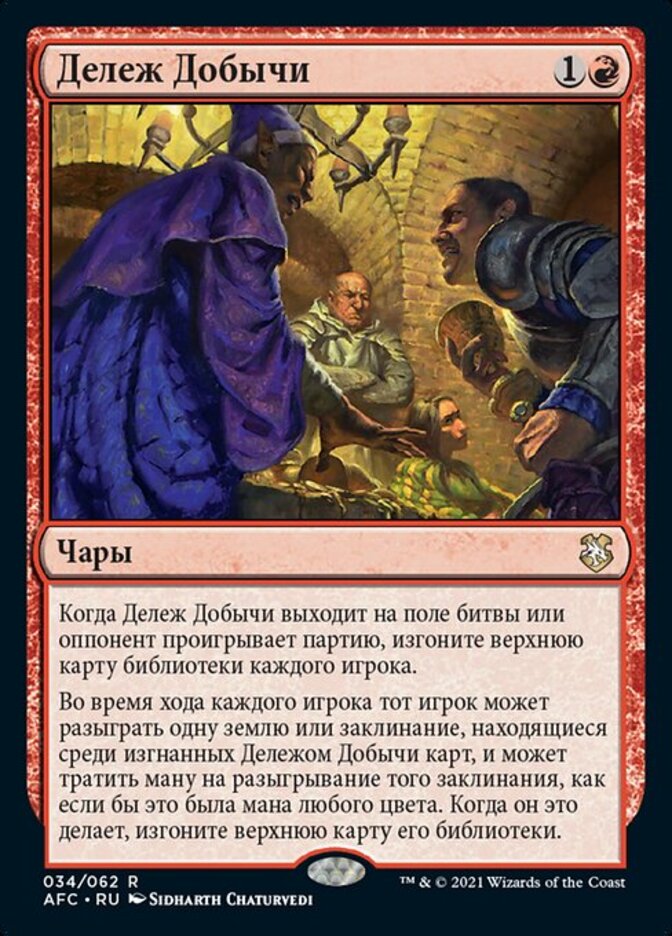 | Rules | When Share the Spoils enters the battlefield or an opponent loses the game, exile the top card of each player's library. During each player's turn, that player may play a land or cast a spell from among cards exiled with Share the Spoils, and they may spend mana as though it were mana of any color to cast that spell. When they do, exile the top card of their library. |