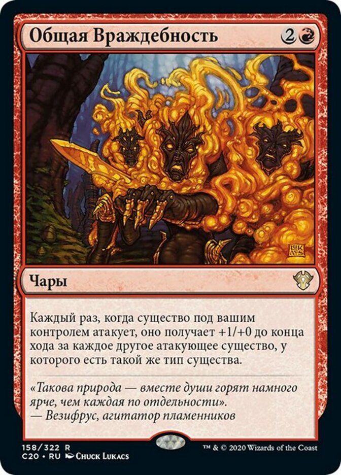 | Rules | Whenever a creature you control attacks, it gets +1/+0 until end of turn for each other attacking creature that shares a creature type with it. |