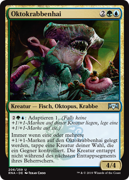 | Rules | : Adapt 1. (If this creature has no +1/+1 counters on it, put a +1/+1 counter on it.) Whenever one or more +1/+1 counters are put on Sharktocrab, tap target creature an opponent controls. That creature doesn't untap during its controller's next untap step. |