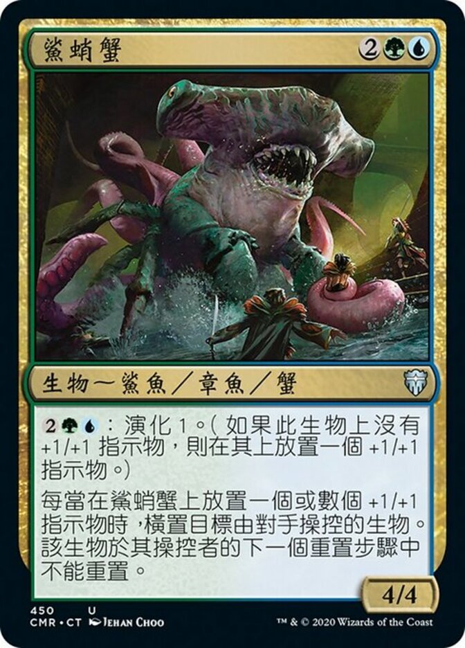 | Rules | : Adapt 1. (If this creature has no +1/+1 counters on it, put a +1/+1 counter on it.) Whenever one or more +1/+1 counters are put on Sharktocrab, tap target creature an opponent controls. That creature doesn't untap during its controller's next untap step. |