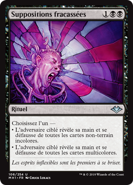 | Rules | Choose one — • Target opponent reveals their hand and discards all colorless nonland cards. • Target opponent reveals their hand and discards all multicolored cards. |
