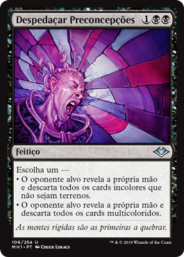 | Rules | Choose one — • Target opponent reveals their hand and discards all colorless nonland cards. • Target opponent reveals their hand and discards all multicolored cards. |