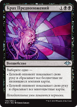 | Rules | Choose one — • Target opponent reveals their hand and discards all colorless nonland cards. • Target opponent reveals their hand and discards all multicolored cards. |