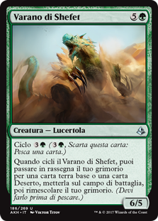 | Rules | Cycling (, Discard this card: Draw a card.) When you cycle Shefet Monitor, you may search your library for a basic land card or a Desert card, put it onto the battlefield, then shuffle. (Do this before you draw.) |