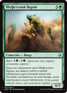 | Rules | Cycling (, Discard this card: Draw a card.) When you cycle Shefet Monitor, you may search your library for a basic land card or a Desert card, put it onto the battlefield, then shuffle. (Do this before you draw.) |
