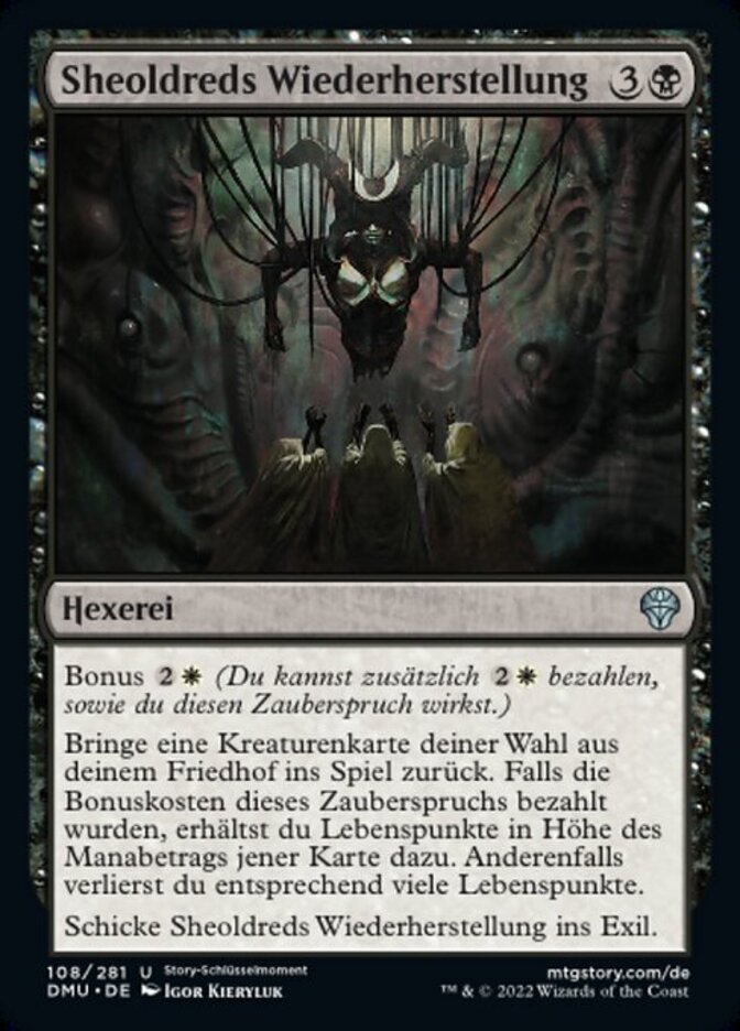 | Rules | Kicker (You may pay an additional as you cast this spell.) Return target creature card from your graveyard to the battlefield. If this spell was kicked, you gain life equal to that card's mana value. Otherwise, you lose that much life. Exile Sheoldred's Restoration. |