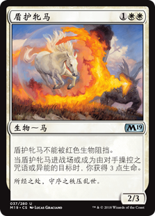 | Rules | Shield Mare can't be blocked by red creatures. When Shield Mare enters the battlefield or becomes the target of a spell or ability an opponent controls, you gain 3 life. |