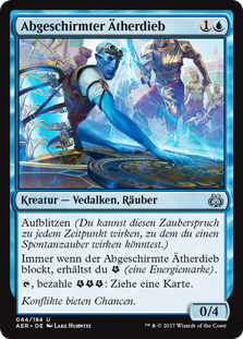 | Rules | Flash (You may cast this spell any time you could cast an instant.) Whenever Shielded Aether Thief blocks, you get (an energy counter). , Pay : Draw a card. |