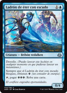 | Rules | Flash (You may cast this spell any time you could cast an instant.) Whenever Shielded Aether Thief blocks, you get (an energy counter). , Pay : Draw a card. |