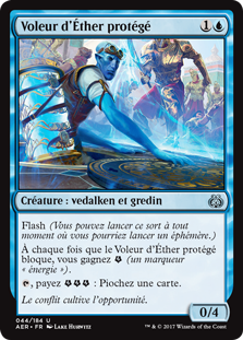 | Rules | Flash (You may cast this spell any time you could cast an instant.) Whenever Shielded Aether Thief blocks, you get (an energy counter). , Pay : Draw a card. |
