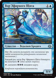 | Rules | Flash (You may cast this spell any time you could cast an instant.) Whenever Shielded Aether Thief blocks, you get (an energy counter). , Pay : Draw a card. |