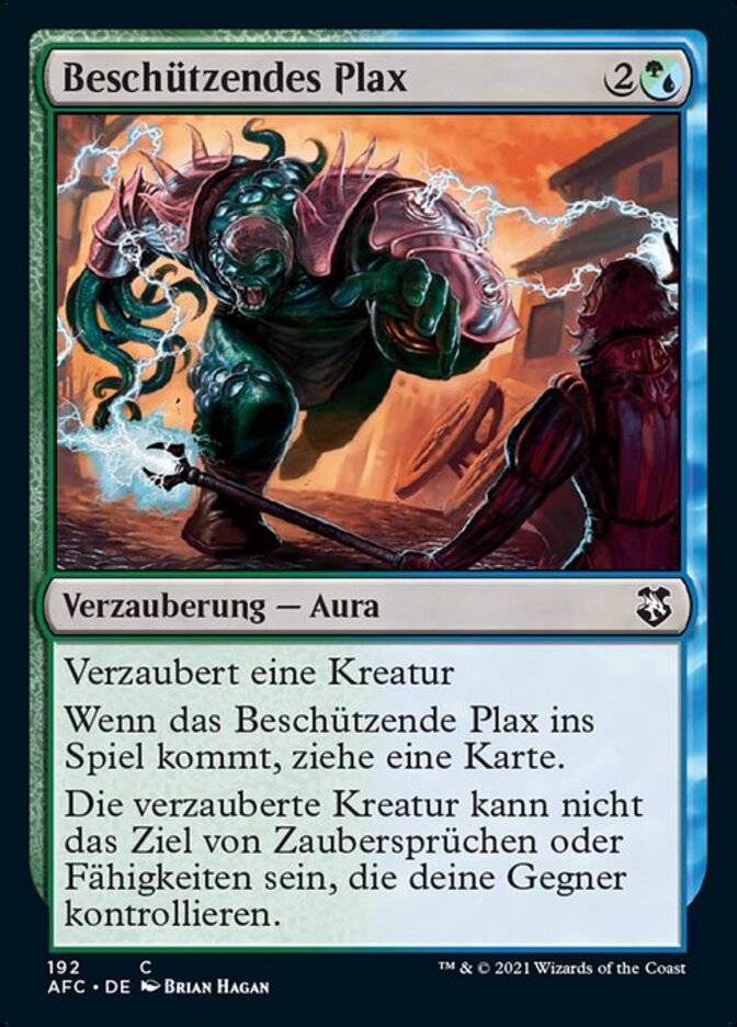 | Rules | ( can be paid with either or .) Enchant creature When Shielding Plax enters the battlefield, draw a card. Enchanted creature can't be the target of spells or abilities your opponents control. |