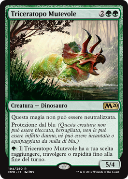 | Rules | This spell can't be countered. Protection from blue (This creature can't be blocked, targeted, dealt damage, enchanted, or equipped by anything blue.) : Shifting Ceratops gains your choice of reach, trample, or haste until end of turn. |