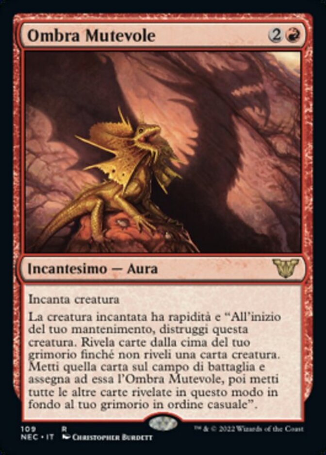 | Rules | Enchant creature Enchanted creature has haste and "At the beginning of your upkeep, destroy this creature. Reveal cards from the top of your library until you reveal a creature card. Put that card onto the battlefield and attach Shifting Shadow to it, then put all other cards revealed this way on the bottom of your library in a random order." |