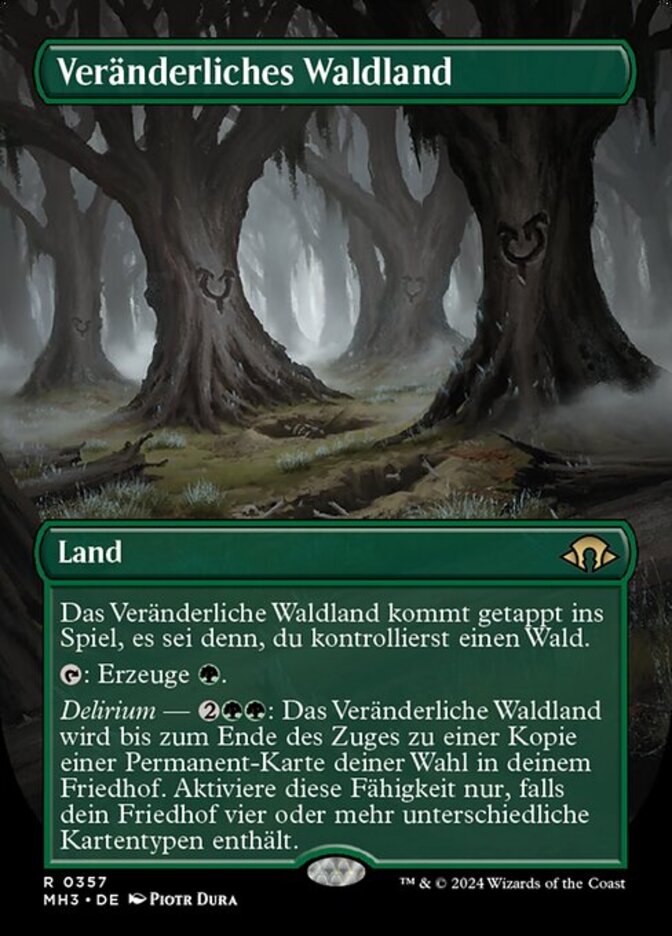 | Rules | Shifting Woodland enters the battlefield tapped unless you control a Forest. : Add . Delirium — : Shifting Woodland becomes a copy of target permanent card in your graveyard until end of turn. Activate only if there are four or more card types among cards in your graveyard. |
