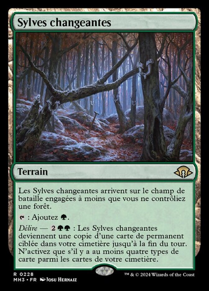 | Rules | Shifting Woodland enters the battlefield tapped unless you control a Forest. : Add . Delirium — : Shifting Woodland becomes a copy of target permanent card in your graveyard until end of turn. Activate only if there are four or more card types among cards in your graveyard. |
