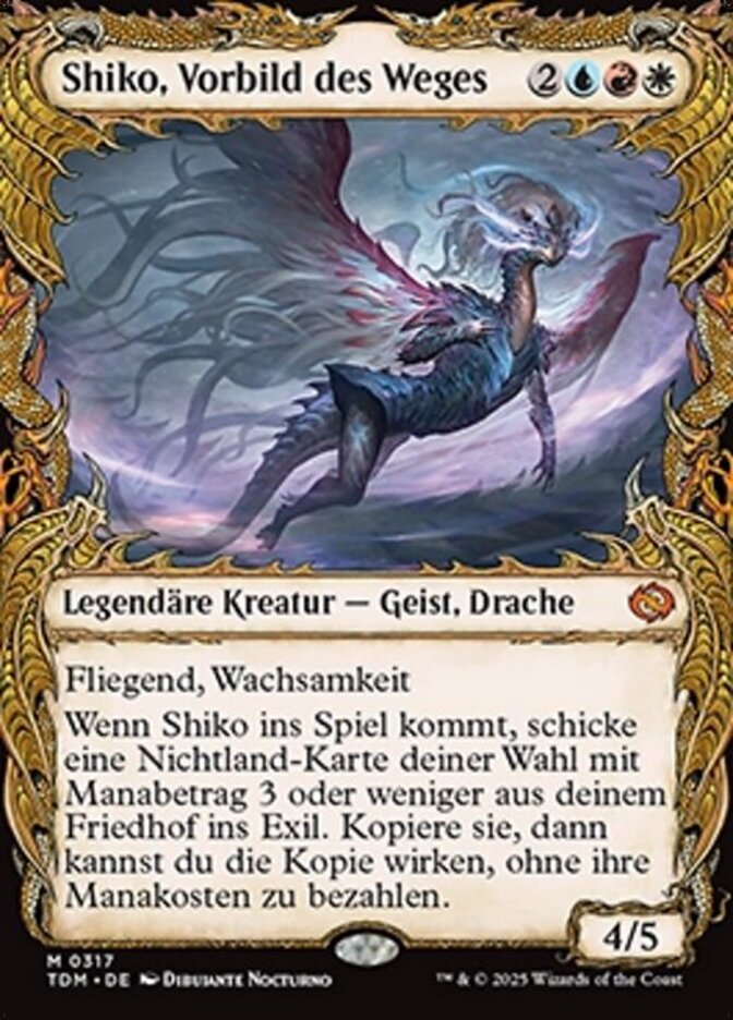| Rules | Flying, vigilance When Shiko enters, exile target nonland card with mana value 3 or less from your graveyard. Copy it, then you may cast the copy without paying its mana cost. (A copy of a permanent spell becomes a token.) |